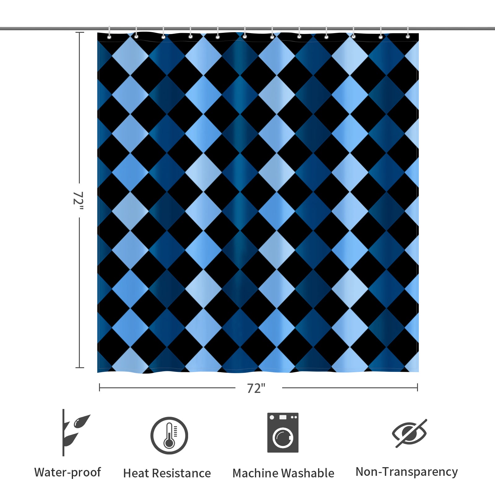 【Product Description 】15.70 Oz. Designed for standardized bath tubs, fitted with C-shaped curtain hooks, approximately 72"(W) x 72"(H). Tough durable waterproof polyester fabric, preventing water from splashing out of the shower stall. One-side printing, using heat dye sublimation technique, long-lasting effects.